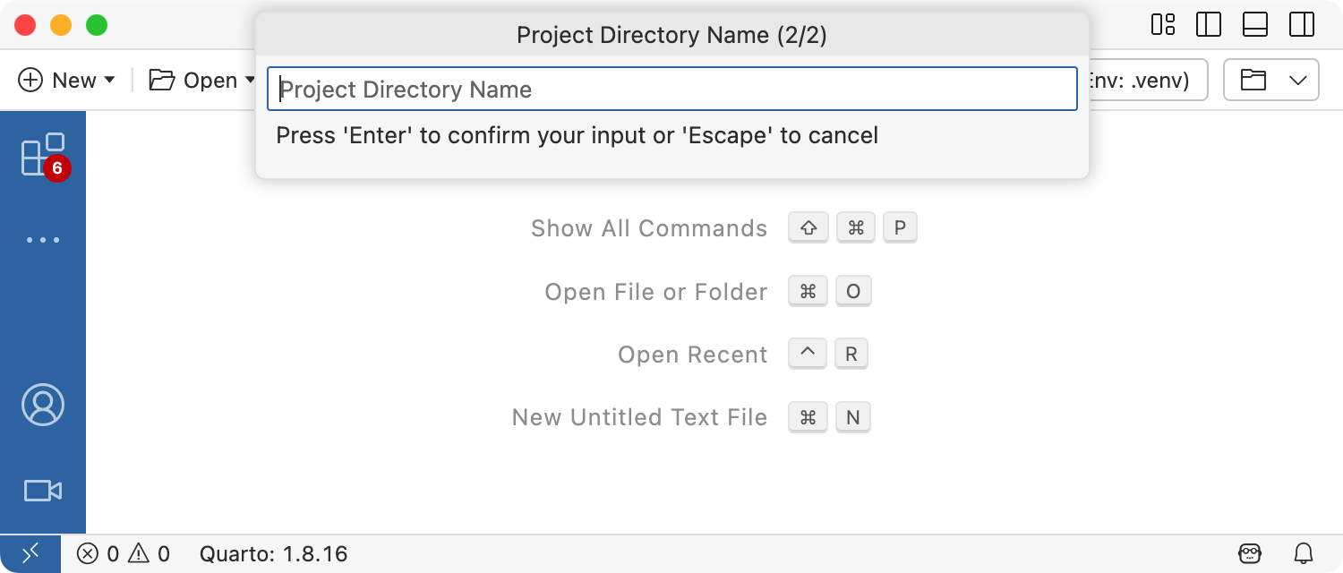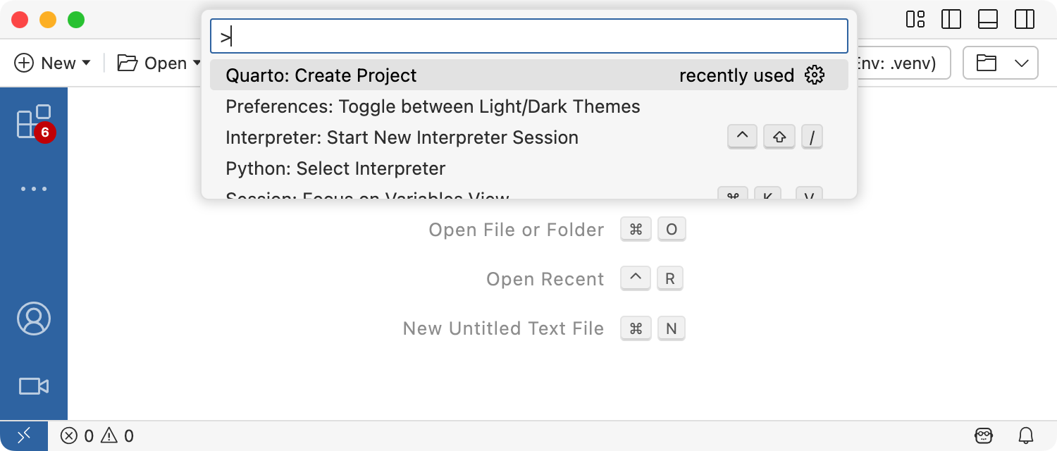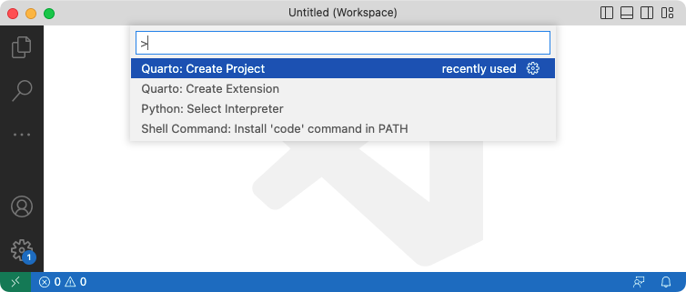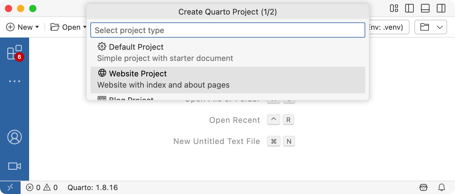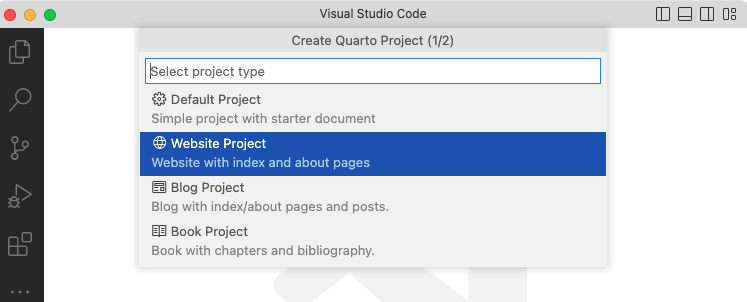 To create a new website project within VS Code, execute the Quarto: Create Project command from the command-palette: