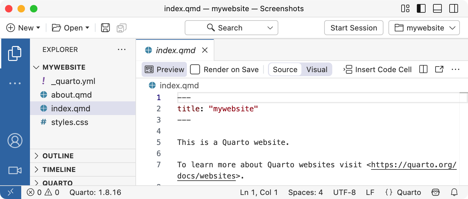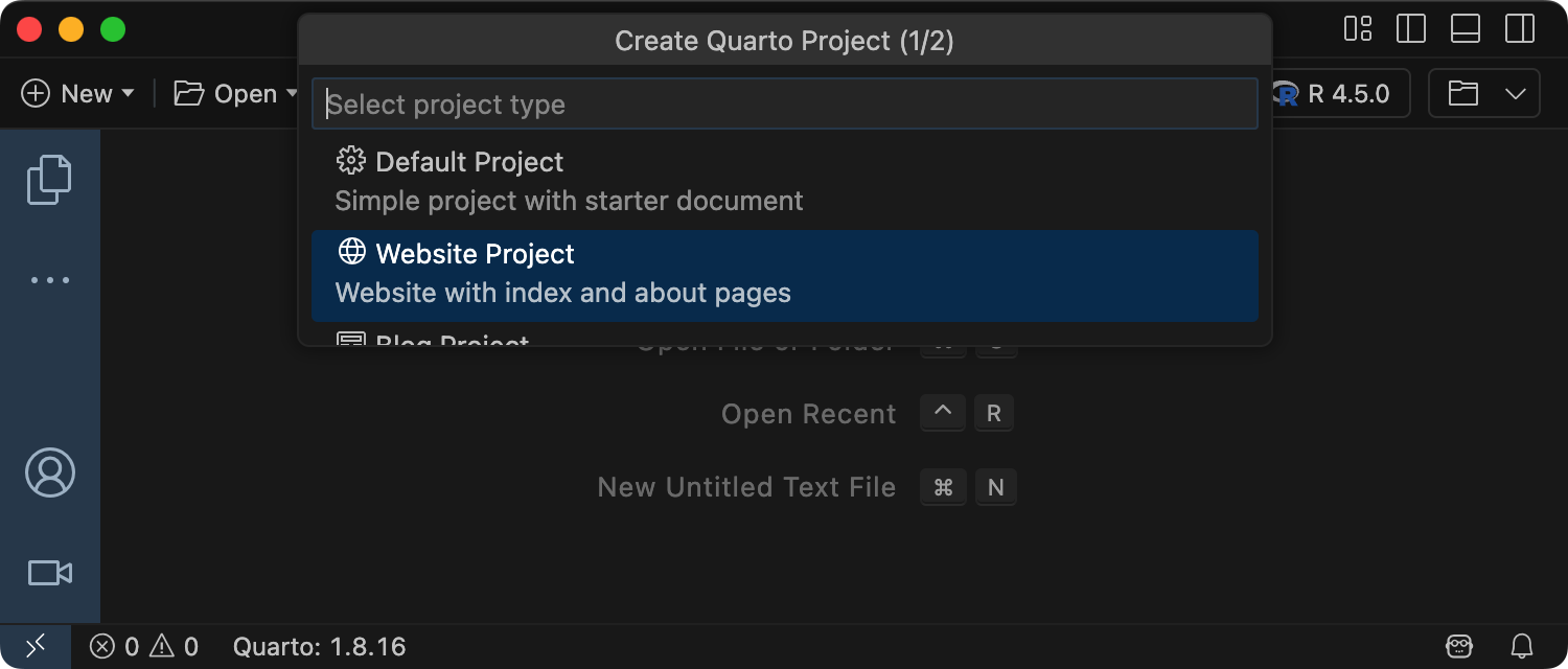 To create a new website project within RStudio, use the New Project command and select Quarto Website: